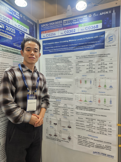 학회 둘째 날에는 제가 준비한 ‘SGLT2 inhibitor alters circulating mitokine levels in patients with chronic kidney disease’라는 주제로 포스터 발표를 진행했습니다. 발표 내용은 만성콩팥병 환자의 혈액에서 mitokine 수치를 측정하여 정상인과의 차이를 비교하고, SGLT2 inhibitor 사용 후 mitokine 수치가 어떻게 변화하는지를 분석한 내용입니다. 세포 스트레스에 반응해 미토콘드리아 DNA에서 유래되어 분비되는 펩타이드인 미토카인에 대한 소개와 함께, 미토카인이 만성콩팥병 환자에서 나타나는 미토콘드리아 손상의 지표로 기능할 수 있으며, SGLT2 inhibitor가 미토콘드리아 손상 회복에 관여할 가능성을 시사하는 표지자로도 활용될 수 있음을 제시했습니다. 이번 연구와 발표는 교신저자이신 순천향대학교 서울병원 이해경 교수님께서 환자 데이터 수집과 통계 분석 과정에 세심한 지도와 도움을 주셨기에 가능했습니다. 또한 먼 학회까지 함께 오셔서 든든한 응원을 보내주신 권순효 교수님께도 깊이 감사드립니다. 두 분의 격려 덕분에 첫 해외 학회 포스터 발표를 무사히 마칠 수 있었습니다.