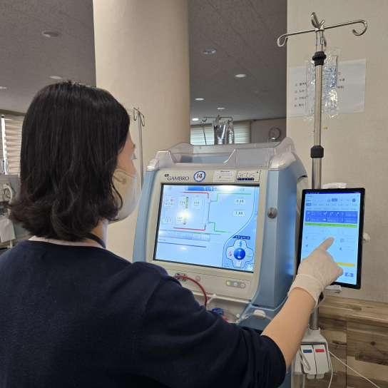 지난 경험과 의료 데이터 표준에 대한 이해를 바탕으로 새로운 방법으로 접근했습니다. 데이터 획득부터 단계적으로 시스템을 쌓아 가기로 한 것입니다. 먼저 디지털 헬스케어의 기반이 되는 전자의무기록부터 개발을 시작했습니다. 대학병원에서 차세대 전자의무기록 시스템 개발에 참여했던 여러 의대 교수님을 부산과 대구, 서울까지 찾아다니며 자문을 구했는데, 처음 뵙는 교수님들도 마치 오래전부터 알던 분들처럼 친절하게 설명해 주셨습니다. 전자의무기록을 무사히 개발한 후, 헬스아바타 프로젝트와 호환되는 디지털 혈액투석 기록지 개발을 본격적으로 시작했습니다. 의료 데이터 표준을 준수하여 외부 시스템과 연동하는 방식으로 구조를 바꾸었습니다. 인공신장실의 체중계, 혈액투석 기록, 간호 기록, 혈액투석기로부터 나오는 데이터, 매월 실시하는 혈액 검사 결과가 실시간으로 한곳에 모이고 갱신되도록 만들었습니다. 시대의 흐름에 맞추어 스마트폰이나 태블릿으로 침상 옆에서 모든 기록 업무를 처리할 수 있도록 구현했습니다. 완성된 시스템을 인공신장실에 설치하여 사용해 보니 간호 업무 효율이 눈에 띄게 향상되었습니다. 체중을 측정하면 침상 옆으로 바로 전송되고 초여과량이 자동으로 계산되면서 체중 관련 오류가 현저하게 줄었습니다. 무엇보다 간호사들이 "이제 계산 실수 걱정할 일이 없어서 좋아요."라며 기뻐할 때 보람을 느꼈습니다. 이 시스템은 2024년 서울에서 열린 아시아-태평양 신장학회 학술대회에서 전시 부스를 열고 시연하였는데, 해외에서 온 의료진들도 관심과 호평을 해주어 나름대로 의미가 있었습니다. 우리나라와 일본에 특허 등록을 마쳤으며, 계속 사용하면서 다듬고 있습니다.