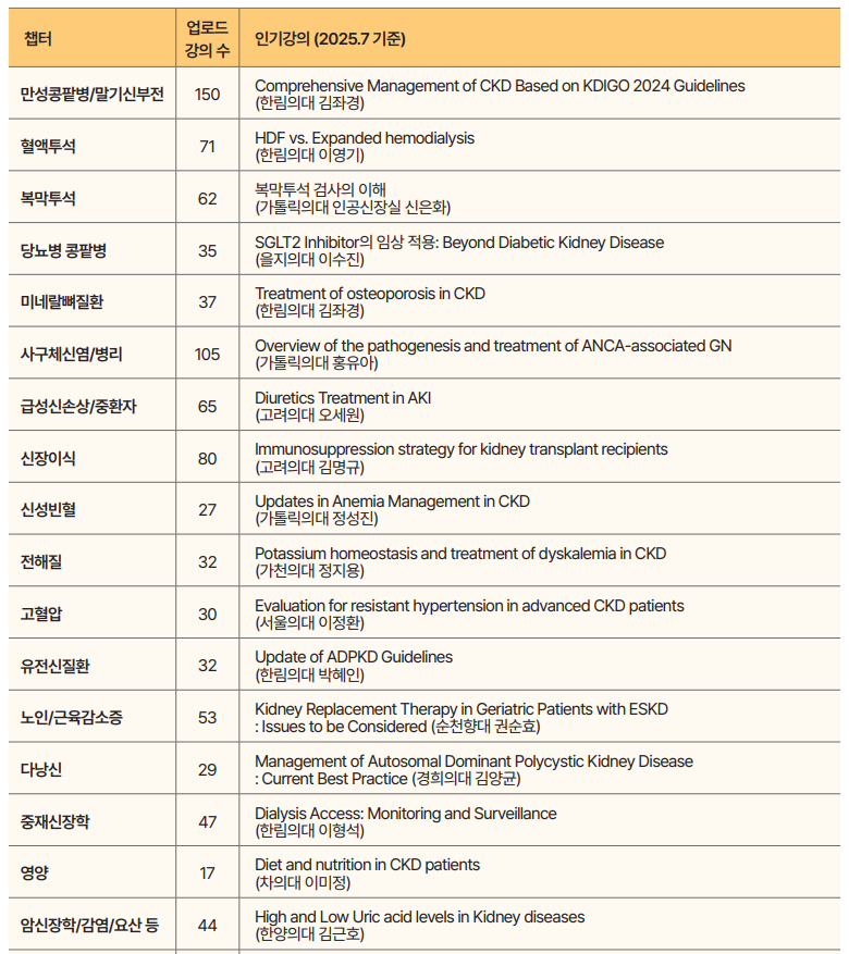 수련교육위원회는 매년 약 300개의 신규 강의를 지속적으로 업데이트하고 있으며, 회원 여러분이 최신 신장학 지식을 더욱 쉽고 편리하게 습득할 수 있도록 검색 기능을 포함한 플랫폼 개선에도 꾸준히 힘쓰고 있습니다.