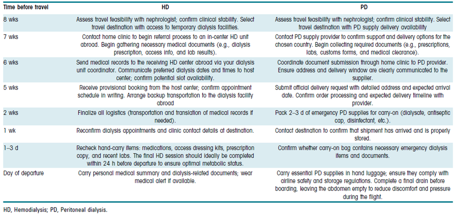 출발 두 달 전까지는 위와 같이 담당 신장내과 의사가 환자 상태에 대한 평가를 진행하는 것이 좋겠습니다. 환자가 여행이 가능한 상태로 판단되면, 목적지에서 투석 치료가 가능한지 확인하는 절차가 필요합니다. 혈액투석 환자분들의 경우에는 해외 투석기관과의 연계를 준비해야 합니다. 필요한 의료 서류를 정리한 뒤, 여행지 투석기관으로 최근 검사 결과와 투석 처방을 전달하여 임시 투석 일정 조율을 시작합니다. 여행 4–5주 전에는 투석 일정이 서면으로 확정되었는지 다시 한번 확인하는 것이 안전합니다. 출발 1–2주 전에는 여행지 투석기관의 연락처와 예약 일정을 최종적으로 점검하고, 출발 1–3일 전에는 기내 휴대 수하물에 포함될 약물, 처방 목록, 혈관통로 관리 용품, 최근 검사 결과 등을 다시 한번 확인합니다. 혈액투석 환자분들의 경우에는 출발 24시간 이내에 마지막 투석을 마치는 것이 일반적으로 권장됩니다. 이러한 준비 과정은 여행 중 체액 과다나 전해질 이상 발생 위험을 줄이는 데 중요한 역할을 합니다.
