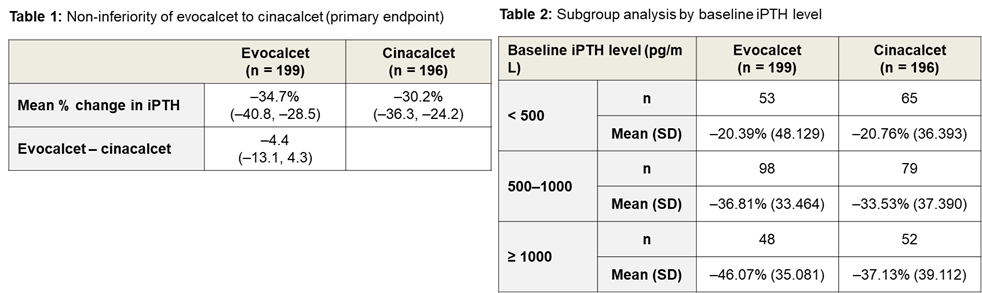 그 결과 평균 iPTH 감소율은 에보칼셋 그룹에서 34.7%, 시나칼셋 그룹에서 30.2%로 나타났다(table 1). 평균 에보칼셋 투여하는 환자의 60-70%가 baseline iPTH 수치보다 30% 이상의 감소 효과를 보였다. 특히, iPTH 수치가 높은 중증 SHPT환자일수록 에보칼셋이 더 큰 iPTH 감소 효과를 보였다(table 2). 또한, 위장관 부작용은 에보칼셋 그룹이 시나칼셋 그룹보다 유의미하게 낮았다(33.5% vs. 50.5%, p=0.001). 즉, 에보칼셋의 효과는 시나칼셋에 비해 비열등하며, 위장관 부작용과 다른 약제와의 상호관련성은 적을 것으로 생각된다.