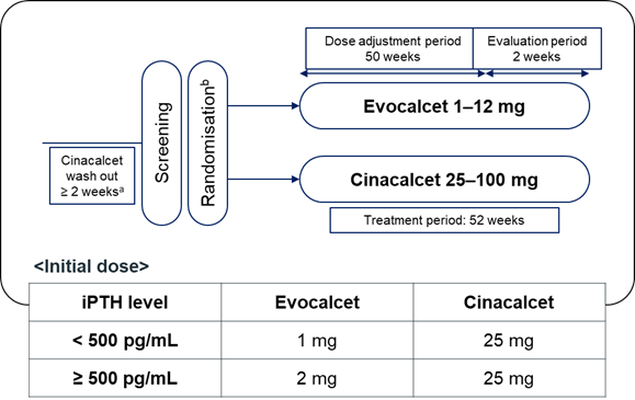 마지막으로 소개할 연구는 에보칼셋의 아시아 3상임상인 ORCHESTRA 연구이다(Kidney Int Rep (2023) 8, 2294–2306). 이 연구는 중국, 홍콩, 한국, 대만에서 진행되었으며, 총 403명의 환자가 등록되었고 이 중 70%이상은 iPTH수치가 500 pg/mL 이상인 환자였다. 국내 연구진도 참여한 이 연구는 에보칼셋과 시나칼셋의 유효성과 안전성을 평가한 52주 장기 연구이다. 아래 [그림 2]에서 볼 수 있듯이, 기존 연구와 동일하게 에보칼셋의 시작 용량은 PTH level에 따라 1 또는 2 mg로 나누어 투여했고, 시나칼셋은 25 mg로 시작하였다.