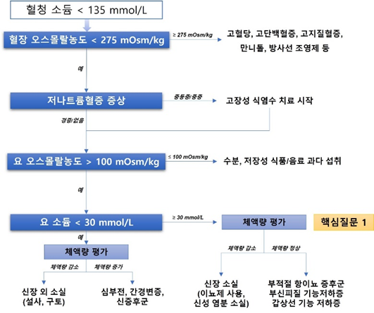 증상이 없는 만성 저나트륨혈증은 즉각적인 교정이 필요하지 않지만 정상나트륨혈증에 비하여 국소 신경학적인 장애, 사망률의 증가를 초래할 수 있다. 경도의 저나트륨혈증 환자조차도 정상과 비교하면 높은 사망률을 보인다. 핵심질문 3에서 다루었듯이, 경도의 저나트륨혈증에서 소듐 교정만을 목적으로 한 치료의 효과는 입증되지 않았으나 저나트륨혈증 자체의 예후가 불량하므로 그 원인질환에 대한 적극적인 평가 즉, 갑상선 기능저하증, 부신피질 기능저하증, 부적절 항이뇨 증후군 등을 조사하고 복용 중인 약제도 검토해야 한다.