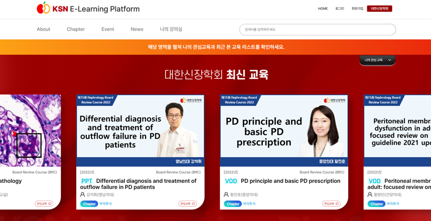 대한신장학회에서는 그간 회원들에게 신장학 교육 컨텐츠를 온라인으로 제공하는 온라인 교육 시스템인 e-Academy를 만들어 KSN 홈페이지에서 운영해왔습니다. 대한신장학회 수련교육위원회에서는 기존의 강의 동영상 모음집 형태의 온라인 교육시스템을 자기주도 학습이 가능한 e-Learning platform으로 개편하고 회원들의 수요에 맞게 제공하고자 합니다. 이를 위해 수련교육위에서는 최근 약 1년에 걸친 기간 동안 의견 수렴, 콘텐츠 제작 및 플랫폼 개편 작업을 진행하였으며, 이번 소식란을 통해 개편된 사이트를 회원들에게 소개할 수 있어 기쁘게 생각합니다. 이번 사이트 개편은 아래 몇 가지 기능에 초점을 맞추어 이루어졌습니다.