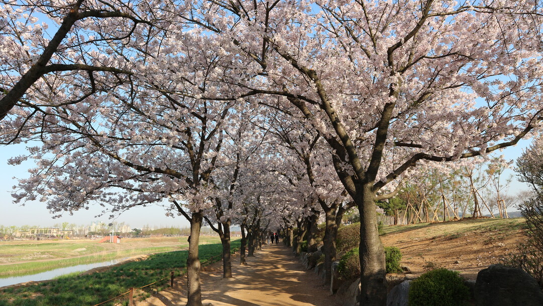 벚꽃 터널 입구에 다가서니 길 옆으로 흐르는 개천과 어우러져 멋진 풍경을 연출한다. 수면 위로 하얀 뭉게구름과 분홍빛 벚나무의 모습이 그려지고, 그 위를 한가로이 떠도는 벚꽃잎의 뱃놀이는 신선놀음이다. 어디선가 불어오는 바람에 꽃잎이 흩날리며 내리는 꽃눈을 사진에 담아보지만 쉽지 않다. 굵은 나무줄기에 동떨어져 핀 벚꽃들은 검은 줄기를 배경 삼아 더욱 도드라진다.