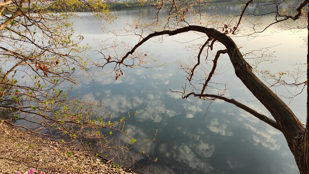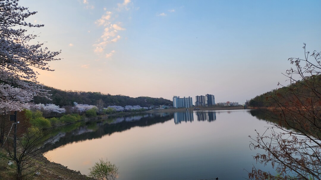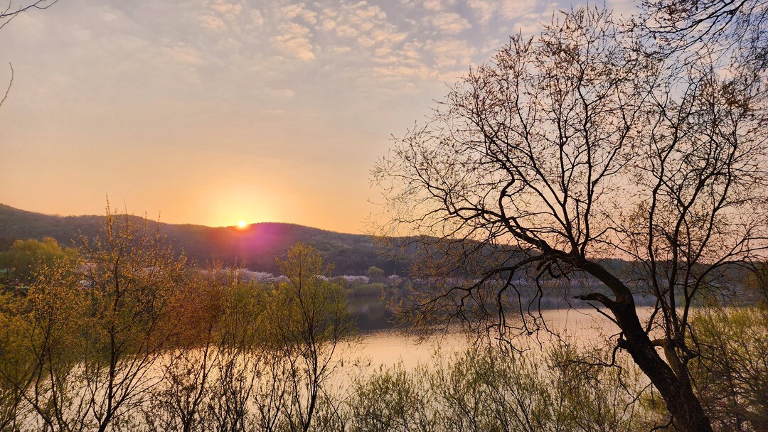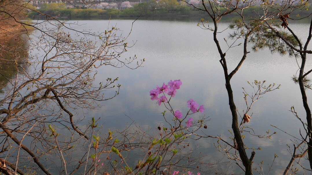 수변 산책로로 이동하여 오솔길을 따라 오르락내리락 걷다 보면, 나무들 사이로 핀 진분홍의 진달래꽃들이 지나는 사람들을 반갑게 맞이한다. 반대편 호수 너머, 산봉우리 사이로 얼굴을 내미는 해님의 모습에 잠시 걸음을 멈추고 넋 놓고 바라본다. 조금씩 떠올라 둥근 얼굴을 붉게 드러낸 자태를 사진으로 담고 걸음을 이어간다.