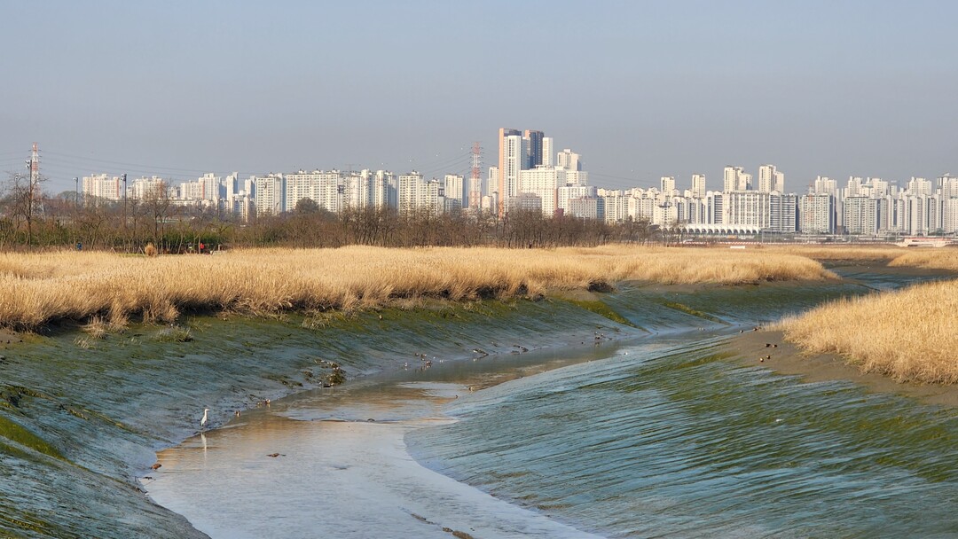 꽃눈이 흩날리는 벚꽃 터널과 황금 갈대의 정경이 아름다운 시흥 갯골길