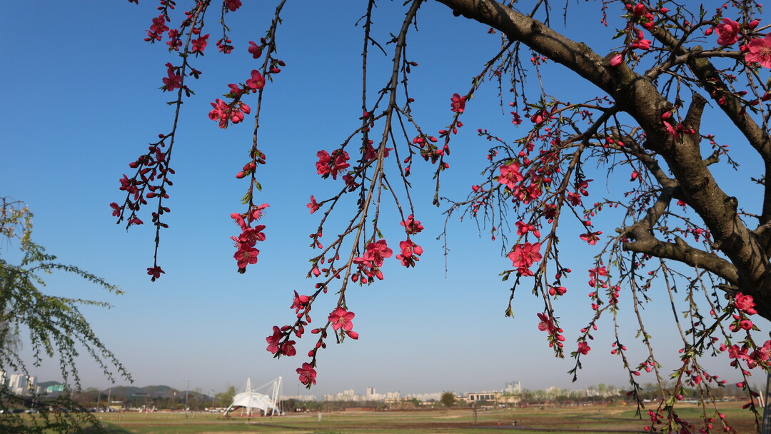 짧은 코스로 갯골생태공원에서 방산대교까지 걷기로 하고 아침 일찍 생태공원 주차장으로 향한다. 여의도에 벚꽃이 만개하여 인산인해를 이루었다는 뉴스를 보고, 갯골생태공원 벚꽃 터널의 모습을 상상 속에 그려본다. 잔디광장을 지나 갈대 벌판 너머로 일렬로 늘어선 벚나무들이 한눈에 들어온다. 길가 그네에는 아침부터 발품을 팔아 나선 연인들이 한가로이 이야기를 나눈다. 능수버들처럼 늘어진 나무에 붉은 꽃을 피운 홍매화는 지나가는 사람들의 발길을 붙잡는다.