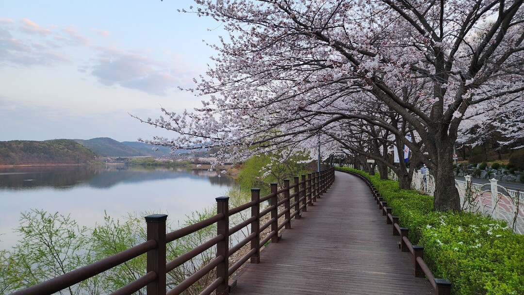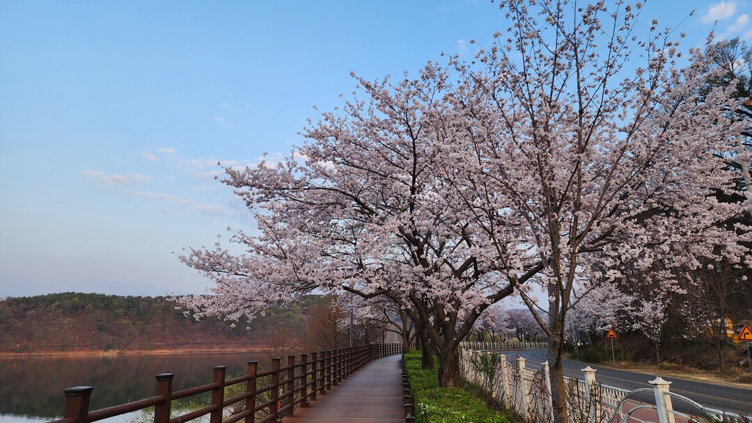 오솔길 중간중간 나무 덱과 계단이 이어지고 어느덧 제방 끝에 다다른다. 벚나무 터널과 산길이 만든 호수 전체의 풍경이 한 폭의 수채화로 그려진다. 주변 언덕에는 보랏빛 제비꽃들이 수줍게 피어 옹기종기 모여서 봄 햇살을 즐긴다. 주차장 입구엔 벚꽃과 메타세쿼이아 나무들이 푸른 하늘과 어우러져, 오늘의 약 1시간 걷기를 마무리하는 선물을 선사한다.