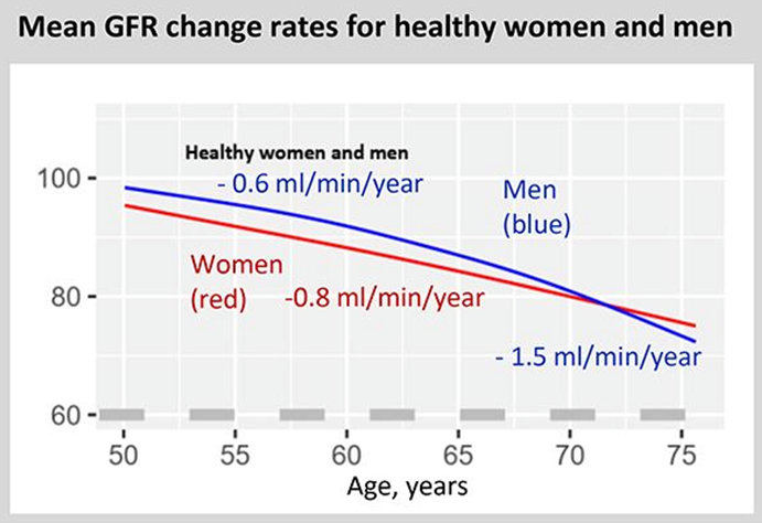 건강인은 비건강인에 비해 사구체 여과율 감소가 느렸으나, 건강 상태가 사구체 여과율 감소 속도의 성별 차이를 설명하지는 못하였다. 백인에 국한된 연구이기는 하나, 중년과 고령의 일반 인구 집단에서 건강 상태와 독립적으로 여성이 남성보다 사구체 여과율 감소가 느림을 보여주었다.