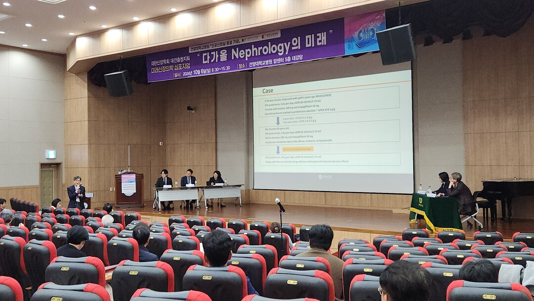 이러한 위기 상황 속에서도 미래신장의학에 대한 논의와 연구, 토론을 언제까지 미룰 수만은 없다고 생각하여 2024년 10월 6일 “미래신장의학 심포지엄 – 다가올 Nephrology의 미래”를 개최하였습니다. 이번 심포지엄에는 전국 각지에서 진료, 연구, 교육의 높은 권위와 실력을 지닌 선생님들을 좌장, 연자, 패널로 모시어 활발한 토론의 장을 마련했습니다. 총 3개의 세션으로 구성하여 첫 번째 세션에서는 콩팥병 분야의 미래를 이끌 새로운 약제 개발, 두 번째 세션에서는 신대체요법의 미래, 세 번째 세션에서는 ‘미래의 진료, 어떻게 바뀔까’를 주제로 다루었습니다. 또한 건양대학교병원 인공신장실 투어 프로그램을 마련하여 참석자들에게 새로 증축한 인공신장실을 소개하는 시간도 가졌습니다.