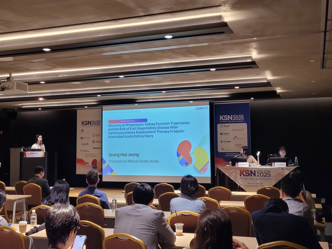 저는 본원에서 지속성 신대체요법(Continuous Kidney Replacement Therapy, CKRT)을 요하는 sepsis-associated 급성 신손상(acute kidney injury, AKI) 환자 중 생존자들을 대상으로 한 연구결과를 발표하였습니다. 이 연구는 CKRT 이후 생존한 환자들의 kidney function trajectories 와 ESKD로의 진행 위험에 대한 내용을 다루었으며, AKI, Fluids&Electrolytes, Hypertensive Nephrology 세션에서 발표하였습니다.