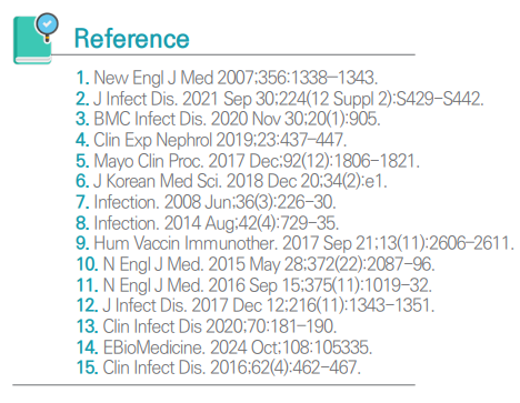 만성콩팥병 환자는 전반적인 면역 기능 저하, 요독증으로 인한 면역 조절 이상, 투석으로 유발되는 전신 염증 반응 등으로 인해 감염 위험이 크다 [4]. 체계적 문헌 고찰 및 메타분석에 따르면, 만성콩팥병 환자의 대상포진 발생 위험은 일반 인구 대비 상대위험도 1.29로 보고되었으며 [5], 국내 데이터에서는 대상포진 재발 위험도가 1.344로 증가하는 것으로 나타났다 [6]. 또한, 만성콩팥병 환자는 대상포진 후 신경통과 같은 합병증, 입원이 필요한 중증 감염으로 진행될 위험이 크다. 나아가, 대상포진은 만성콩팥병의 진행을 가속화하고 말기 콩팥병으로의 이행 위험을 높일 수 있다.