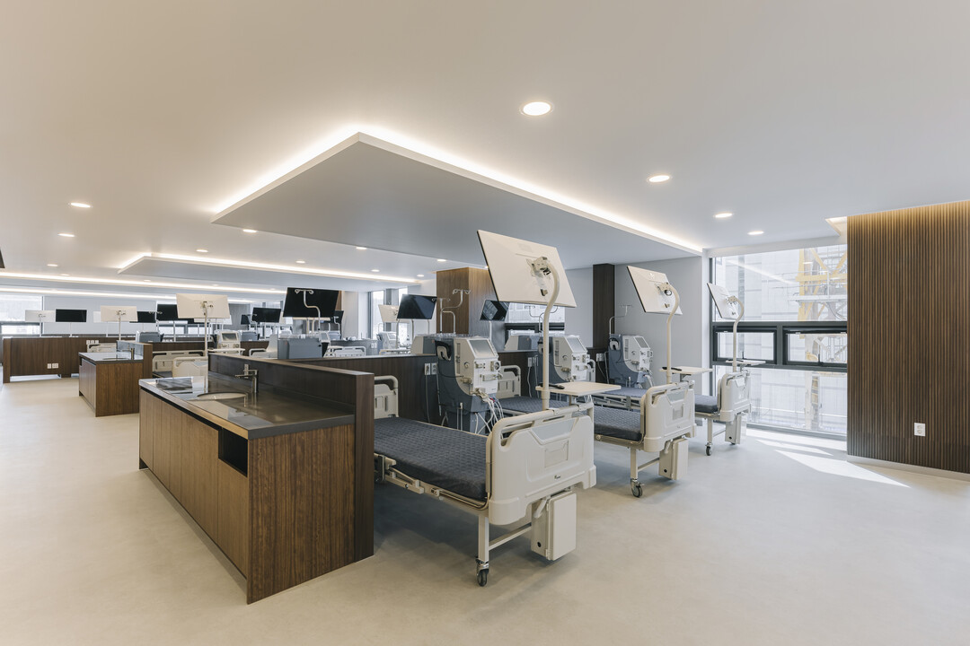 그리하여 3면이 통창인 건물을 선택했고, 일반적으로 혈액투석 침상을 2-3개 열로 길게 배치하는 대신 간호사 데스크를 중심으로 9개 열로 나누었습니다. 한 열당 침상은 3개 내외로 구성해 간격을 넓히고 소음을 줄였으며, 환자분들이 조금 더 조용하고 개별적인 치료를 받을 수 있도록 하였습니다.