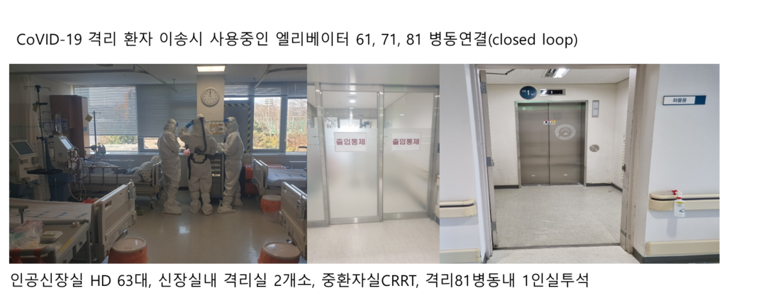 특히 이러한 적극적인 진료 경험은 COVID-19 상황에서 지역사회에 크게 기여하였습니다. 울산대학교병원은 2020년 2월 울산지역 내 첫 환자가 발생하자 그 즉시 병동 한 개소(81병동)을 비워서 격리 40병상을 마련했고, 2021년 3차 대유행 때는 130병상을 코로나19 환자만을 위해 운영한 바 있습니다. 이는 울산에서 발생한 코로나19 확진 환자가 1,015명인데 울산대병원에 입원한 사람이 603명이므로 지역 확진자의 60%를 원내 격리 입원 치료하였으며(2020년 2월~2021년 1월 기준), 신장내과도 예외는 아니어서 울산광역시 내에 투석 확진 환자에 대해 초기에 전수를 전원 받아 치료하게 되었습니다. 환자가 늘어남에 있어 업데이트된 대한신장학회 인공신장실 감염관리지침을 준수하면서도 감염병 재난에 효율적으로 대응하기 위하여, 격리실 1인 격리 투석 외에도, 격리 병동 3곳 내에 음압 격리 투석실을 추가로 설치하여 격리 병동 내에서 closed loop으로 운영하여 추가적인 확산 없이 성공적으로 혈액투석 COVID-19 확진 환자를 치료해 낸 바 있습니다(사진 3).