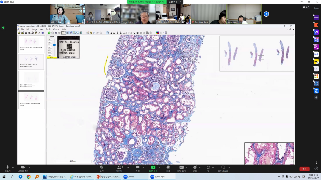 소아 신장 조직 검사는 영상의학과에 의뢰하지 않고 매년 20~30례를 소아신장분과에서 직접 시행하고 있으며, 그 결과를 격주마다 개최되는 신장병리 콘퍼런스에서 확정하고 있습니다. 병리과 김용진 교수님을 비롯하여 한만훈, 김미선 교수 및 신장내과 교수님들과 함께 정확한 진단을 위한 노력을 계속하고 있으며, 코로나 유행 이후에는 온라인 화상회의를 통해 본원과 칠곡경북대병원에서 동시에 콘퍼런스를 진행하고 있습니다(사진 3).