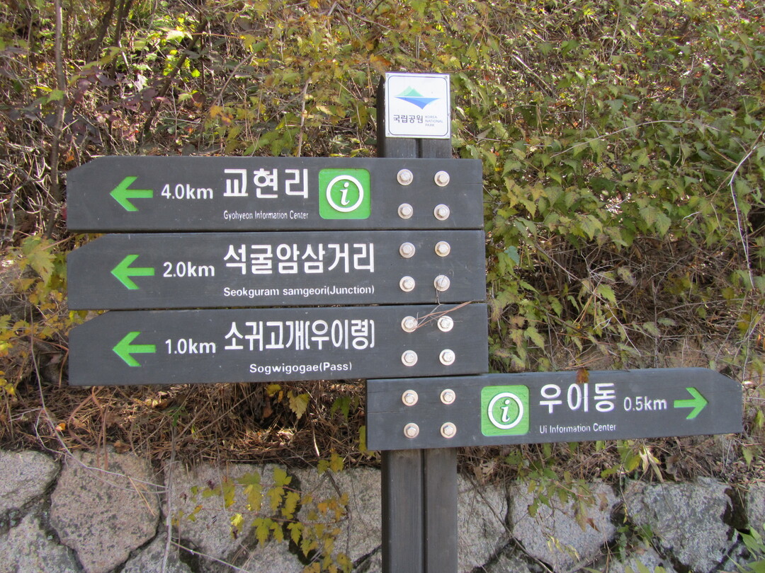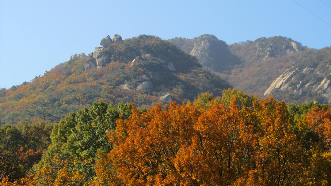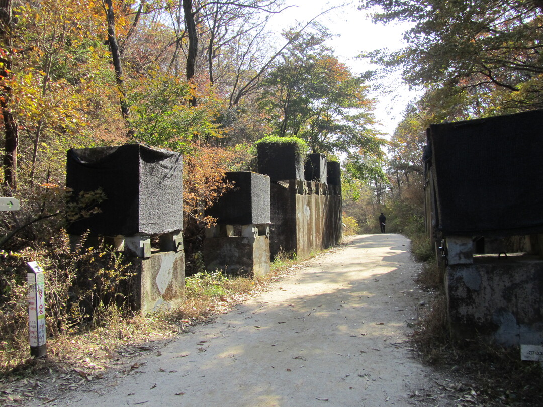 다시 걷기를 시작하고 얼마 후 말로만 듣던 우이령 고개가 나타났다. 6.25 전쟁의 부산물로 남아있는 대전차장애물이 욱뚝 서 있는 곳이 말로만 듣던 우이령 고개다. ‘시대의 아픔을 같이 한 우이령길’이라는 설명이 마음속 깊이 와닿는다. 고개를 넘어서자 멀리 5개의 봉우리가 오색찬란한 단풍을 배경으로 우뚝 서 있었다.