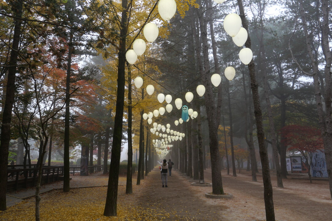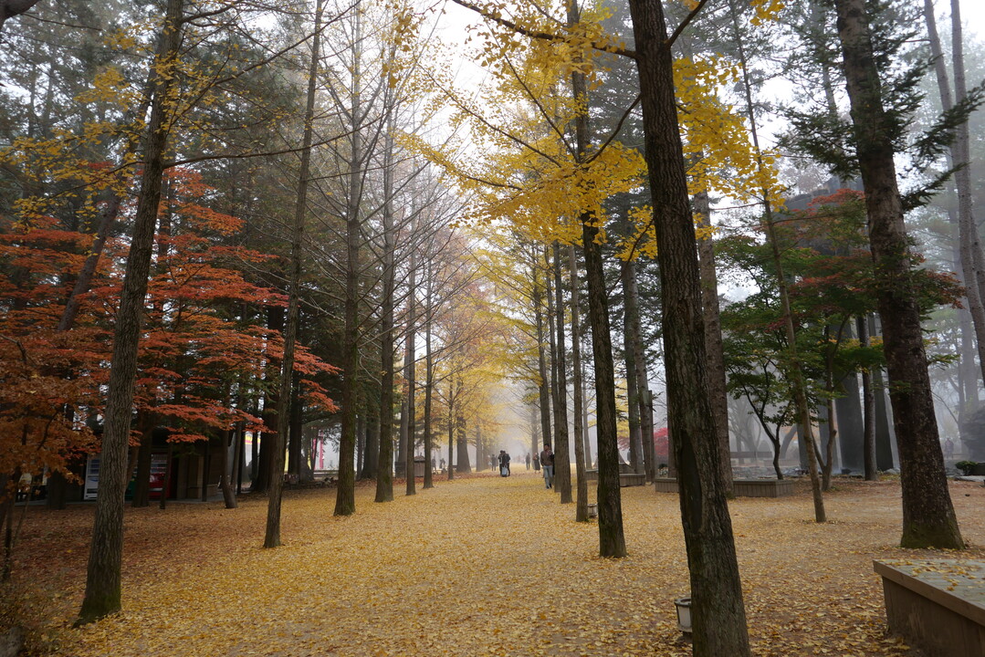 예전보다는 화려해진 입구의 조형물들을 보니 나미나라공화국이라는 이름처럼 또 다른 동화 속 나라로 여행을 떠나는 느낌이다. 남이섬 가을 단풍을 대표하는 은행나무길을 따라 천천히 걸으니 노랗게 물든 은행나무들과 주변의 조형물들이 조화를 이뤄 멋진 풍광으로 나타난다. 출사를 온 작가들은 서로의 의견을 나누며 작품 사진 완성을 위한 셔터를 누르기 바쁘다.