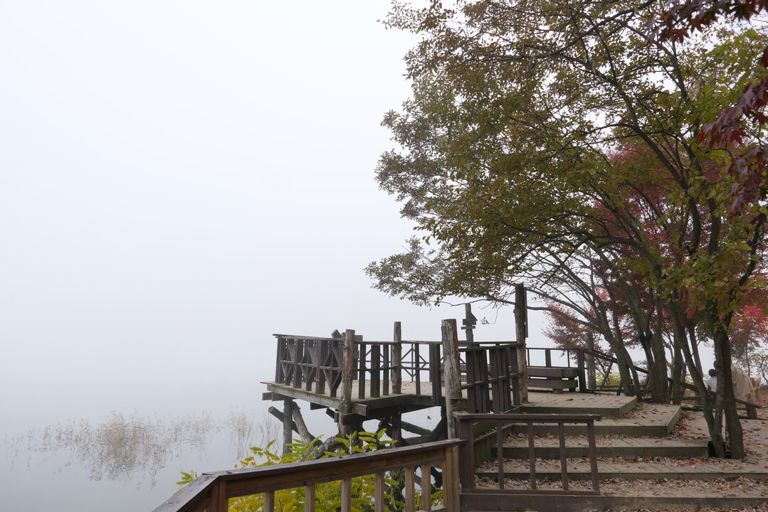 오솔길을 따라 섬 끝 전망대에 도착해서 보니 짙은 새벽안개로 풍경이 가려져 있지만 가끔 안개 사이로 비치는 햇살을 받아 나타나는 풍광이 아름답다. 강변을 따라 이어지는 나무데크를 걸어가니 앙상한 가지만 남은 나무가 안개와 어우러져 만든 한 폭의 산수화 풍경이 우리를 기다린다.