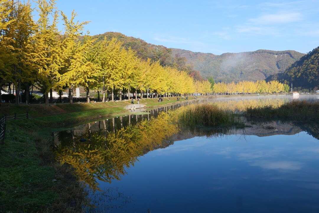 이리저리 옮겨 다니며 여러 장의 작품을 사진기에 담고 은행나무 입구로 가서 천천히 걷기를 시작한다. 길 양쪽으로 길게 늘어선 은행나무들은 가을을 상징하는 노란 가을옷으로 예쁘게 단장하고 오는 손님들을 반갑게 맞아준다. 저수지 주변으로는 아직도 많은 사진작가가 열심히 셔터를 눌러대며 흡족한 표정으로 이야기를 나눈다.