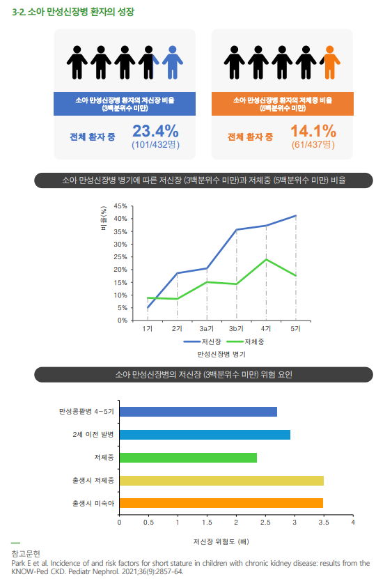 이에 우리나라 질병관리청의 지원으로 “유형별 만성 신장 질환자 생존 및 신기능 보존 10년 추적 조사 연구(KNOW-KIDNEY)”의 일부로 우리나라 소아청소년 만성콩팥병 환자를 전향적으로 추적하는 “한국 소아 만성 콩팥병의 전향적 추적 연구”(KNOW-Ped CKD, Korean Cohort Study for Outcome in patients With Pediatric Chronic Kidney Disease)가 시작되어 1차 코호트 연구를 마치고 현재 1차 코호트 연장 연구와 2차 코호트 연구가 진행되고 있다.