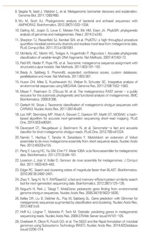 NGS 분석이 활성화된 요즘, 마이크로비옴 분석에 흥미를 갖는 연구자들이 늘어나면서 다양한 분석 tool 과 관련 데이터베이스가 지속적으로 생성 및 업데이트 되고 있다. 현재 대부분의 자주 사용되는 tool 들은 리눅스 기반의 command-line 환경에서 분석을 진행할 수 있으나, 웹서버 기반 (MG-RAST, IMG/M, Orphelia 등) 의 쉽게 접근 가능한 tool 도 지속적으로 제공되고 있어 command-line 환경에 친숙하지 않은 연구자들도 분석이 가능하다.