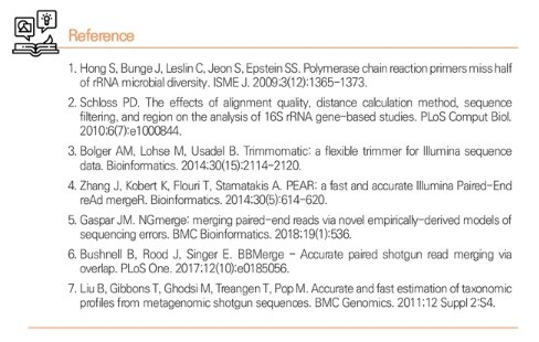 이후의 분석은 paired-end set 의 merging 후 진행하기도 하고, merging 을 생략하고 forward-reverse read 를 해당 분석 tool 의 pipeline 에 각각 넣기도 한다. Merging 을 하는 tool 로는 PEAR 가 최근 사용되고 있고, NGmerge, BBMerge 등의 tool 도 사용할 수 있다.