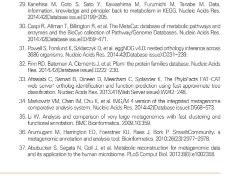 Raw read 의 경우는 짧기 때문에 단백질에 대한 정보가 부족할 수 있는 반면 버리는 sequence 가 없다는 장점이 있고, Assembly 된 경우는 비교적 정확하게 기능 단백의 양을 count 할 수 있다. MG-RAST(https://www.mg-rast.org/), IMG/M (https://img.jgi.doe.gov/m/) 등의 tool 이 이러한 웹서버 기반의 분석을 제공한다.