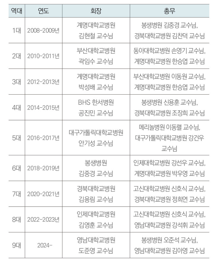세계적으로 혈관 외과술과 이식면역이 획기적으로 발전하면서 장기이식 분야가 활발해졌고, 우리나라에서도 장기이식 수술이 발전하며 이식 건수가 증가하였습니다. 이러한 변화에 발맞추어 영남내과계 신이식 연구회는 영남지역 신장이식을 더욱 활성화하고 연구와 토론을 통한 진료의 향상, 회원 간의 친목과 유대 강화를 목적으로 설립되었습니다. 영남내과계 신이식 연구회 이전에도 부산, 울산, 경남지회와 대구, 경북지회 주관으로 2001년도부터 영남신장병 연구회가 매년 개최되어 영남지역에서 활 발한 학문적 교류를 지속하였으나, 신장이식을 주축으로 한 논의는 부족했습니다. 이에 2008년, 계명의대 김현철 초대회장과 봉생병원 김중경, 경북의대 김찬덕 2인의 총무 이사가 중심이 되어 연구회 활동을 시작했으며, 같은 해 3월 부산 김원묵기념 봉생병원에서 첫 집담회를 개최하였습니다. 창립 당시 31명의 회원으로 시작한 연구회는 현재 신장내과뿐 아니라 병리과, 소아청소년과, 진단검사의학과 등 신장이식과 관련된 여러 분야의 전문의 약 160명이 정회원으로 활동하고 있습니다.