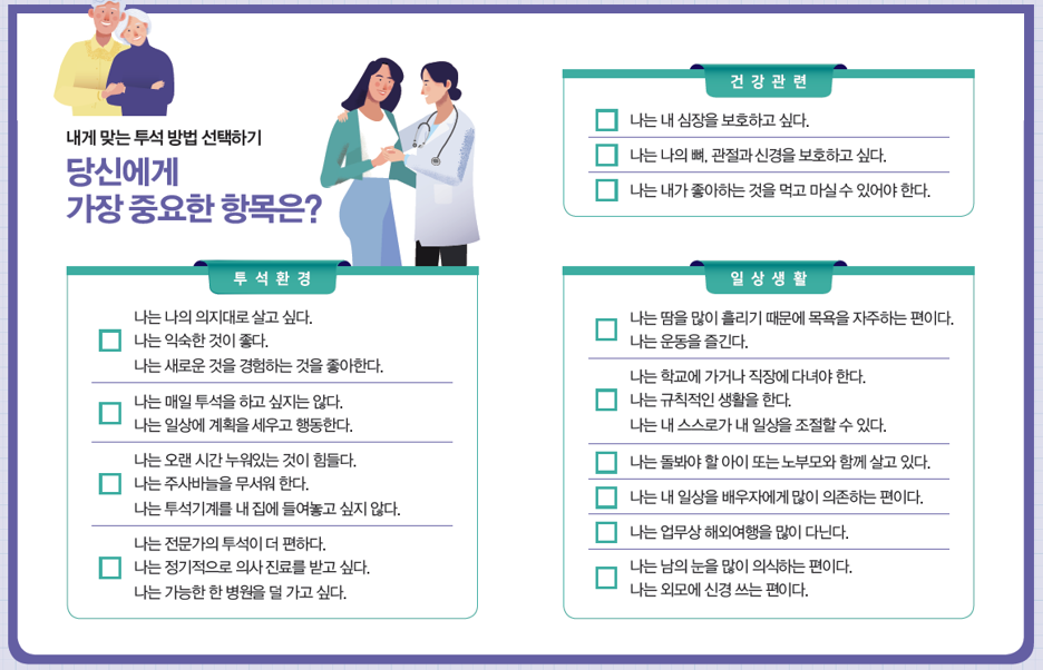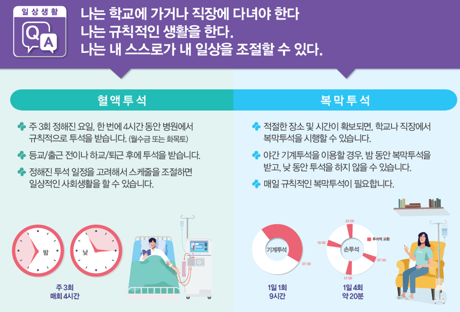 삶의 질: 복막투석은 자택이나 직장에서 시행할 수 있어 환자의 일상생활에 미치는 제약이 적다. 이는 환자의 독립성과 자율성을 증진시켜 삶의 질을 향상시키는 데 기여한다. 또한, 치료 시간이 유연하여 환자가 직장 생활이나 사회 활동을 지속할 수 있게 도와준다. 이는 환자의 정신적 건강과 사회적 관계 유지에 긍정적인 영향을 미친다.[1,2]