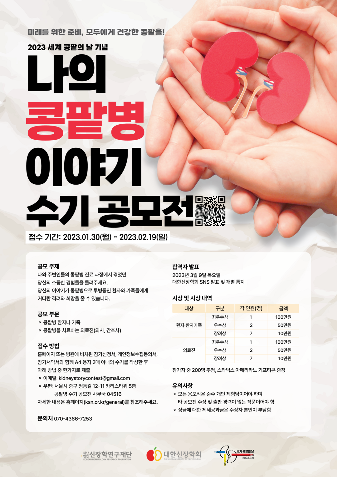 매년 3월 둘째 주 목요일은 ‘세계 콩팥의 날’로 지정되어 있습니다. 콩팥 건강의 중요성에 대한 인식을 높이기 위한 이날에 전 세계적으로 다양한 행사들이 열리고 있습니다. 올해는 ‘미래를 위한 준비, 모두에게 건강한 콩팥을!’이라는 캠페인 아래, 우리 대한신장학회 홍보위원회도 작년 가을부터 여러 위원님들이 함께 머리를 맞대어 뜻깊고 참신한 행사를 기획하고자 노력해 왔습니다. 처음에는 어떠한 행사를 해야 할지 막막했지만 다행스럽게도 기획부터 행사 진행까지 조금씩 결실을 맺어 올해 세계 콩팥의 날 행사를 성공적으로 마칠 수 있었습니다. 저희가 올해 진행했던 캠페인들을 소개해드리고자 합니다.