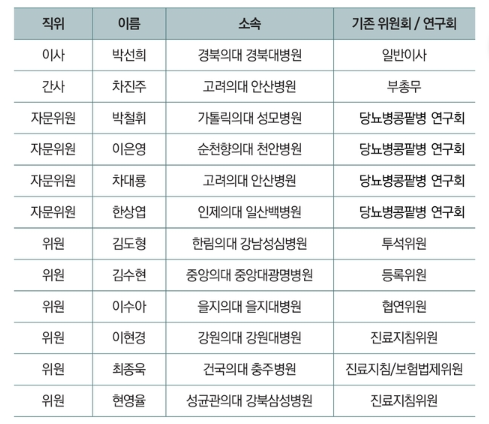 이러한 연계활동을 시행하고자 KHI 특별위원회는 타 위원회의 위원들이 동시에 활동을 하도록 구성하였으며, 오랜 기간 당뇨환자의 진료와 연구에서 축적된 경험과 업적을 가진 교수님들을 자문위원으로 초빙하여 아래와 같이 위원 구성을 하였다.