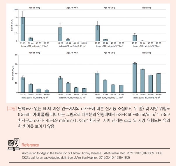 외래 환자를 보다 보면 신기능이 경미하게 감소 (estimated glomerular filtration rate (eGFR) 45-60 ml/min/1.73 m2) 하였으나 단백뇨는 없는 고령의 환자를 흔하게 경험하게 된다. 많은 신장내과 의사들은 이러한 환자들을 병적인 만성 신질환으로 진단해야 하는 것인지 아니면 단순히 고령에 따른 신장 기능의 생리적 감소 현상으로 보아야 하는지에 대해 한번쯤은 고민하게 된다.
