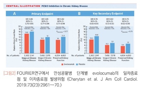 PCSK9 억제제인 evolocumab과 alirocumab은 강력한 LDL 콜레스테롤 강하효과를 바탕으로 심혈관질환을 예방하였으며, 신기능이 저하된 만성콩팥병 환자에서도 부작용의 증가 없이 유사한 심혈관질환 예방효과를 보여주었다.