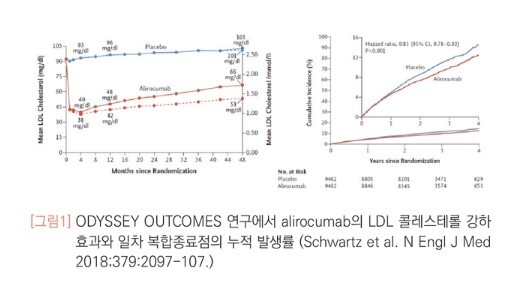 Alirocumab은 ODYSSEY OUTCOMES 연구를 통해 1년 내 심근경색, 불안정성 협심증과 같은 급성관상동맥증후군을 경험한 환자 중 고강도 또는 최대용량 스타틴 사용에도 LDL 콜레스테롤이 70 mg/dL 이상이거나 non-HDL 콜레스테롤이 100mg/dL이상 또는 아포지단백B가 80mg/dL 이상인 환자 18,924 명을 대상으로 주요 심혈관질환 예방효과를 평가하였다.