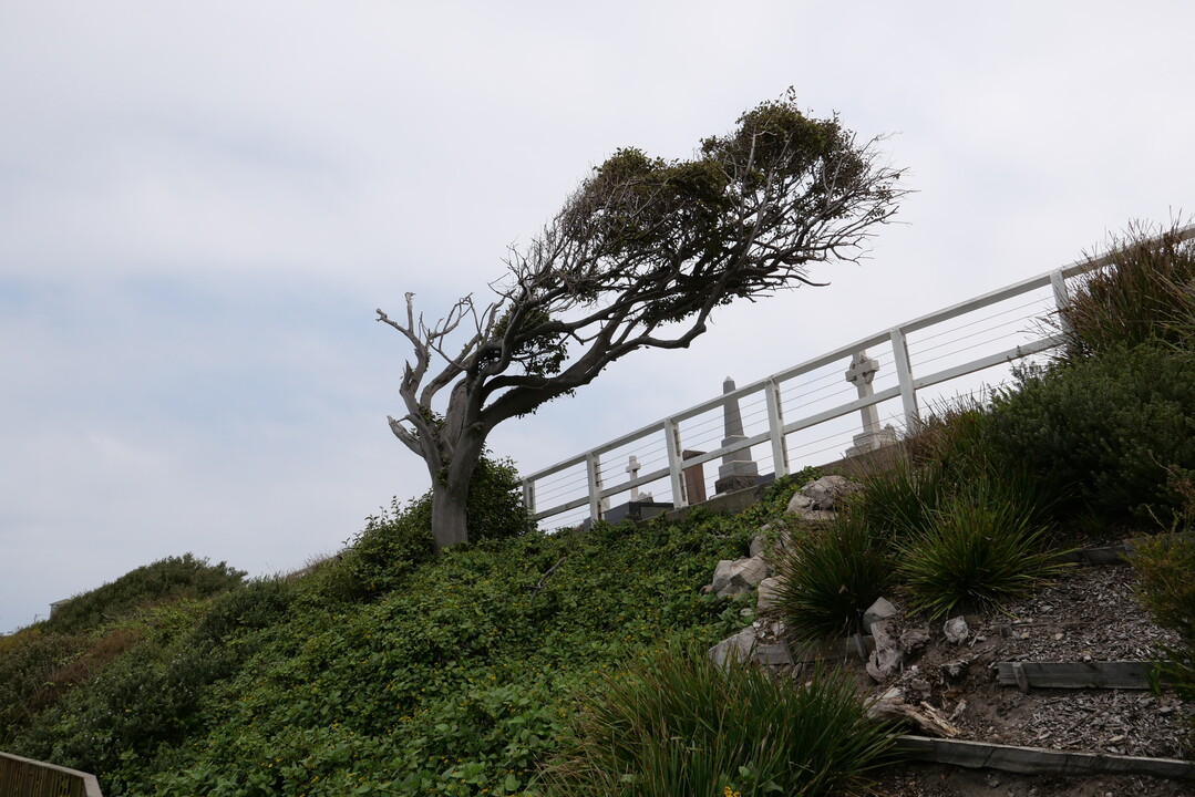산책로가 끝날 무렵 탁 트인 바다 절경과 함께 바위 위로 잘 정비된 나무데크 길이 있다. 바닷가 언덕 공원묘지에는 셀 수 없이 많은 비석이 바다를 나란히 바라보며 물끄러미 서 있다. 푸른 바다와 어우러진 공원묘지의 풍경은 대도시에 잘 꾸며진 그 어느 공원보다도 아름답다. 길가에 우뚝 솟은 나무 한 그루는 세찬 바닷바람에 순응하듯 한쪽으로 기울어져 육지를 향해 자란다. 바닷가 옆으로 넓은 잔디 구장에서는 어르신들이 모여서 해맑은 표정으로 처음 보는 운동을 즐기고 있다. 건물 벽에 붙어있는 설명을 보니 잔디 볼링이라고 적혀 있다. 우리에게는 생소한 운동이다.