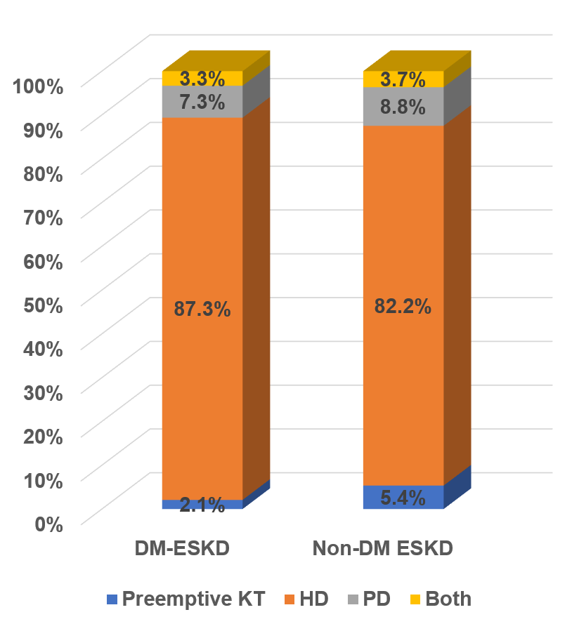2. 신대체요법의 방법: 당뇨 합병증이 동반된 말기신부전 환자의 2.1%만이 선제적 이식을 받았으며 7.6%만이 신장 이식을 받았다. 이는 당뇨 합병증이 동반되지 않은 말기신부전 환자에 비해 현저히 낮은 비율이었다.