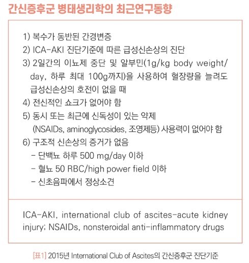 이러한 급성 신손상 개념을 기반으로 하여 진단되는 간신증후군의 진단은 표1과 같다. 기본적으로 급성 신손상의 기준에 부합하는 환자이며, 복수가 동반된 상태에서 신기능 악화의 다른 원인이 배제되고 2일간의 이뇨제 중단 혹은 알부민을 사용하여도 급성신손상의 호전이 없는 경우를 간신증후군으로 진단한다.