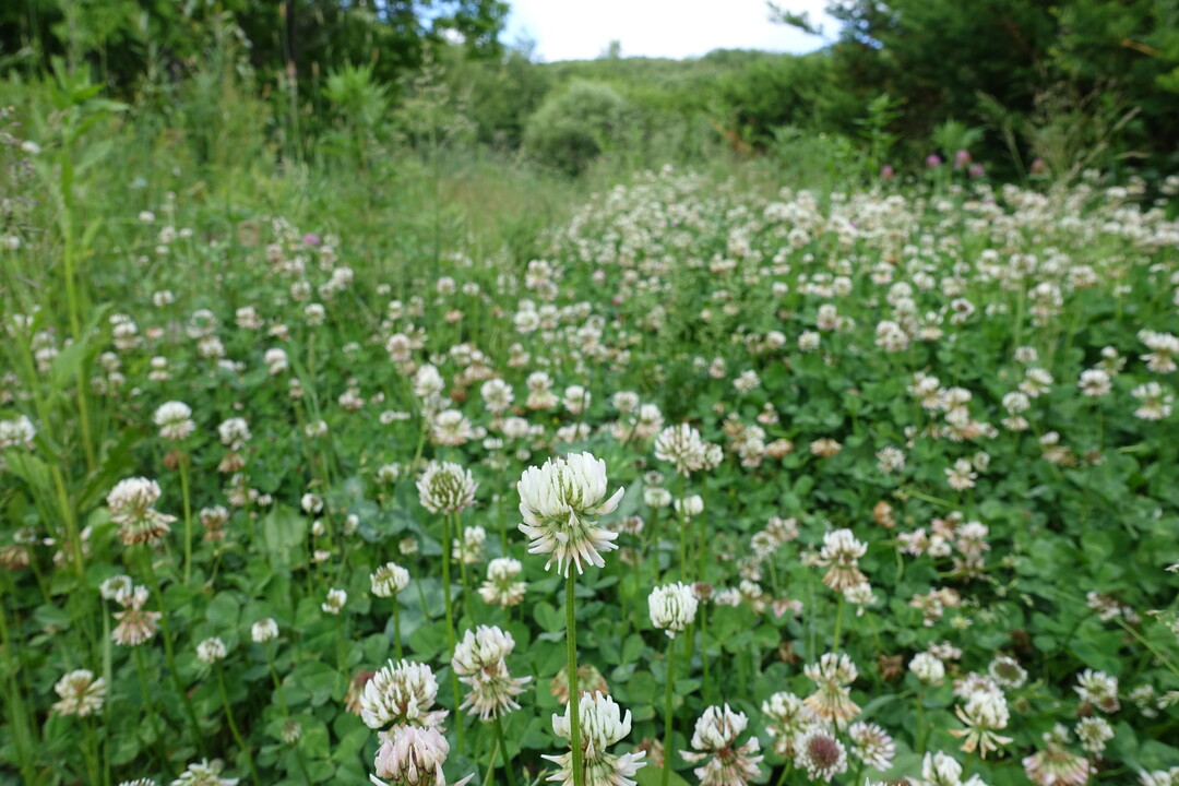 숲길이 끝나고 언덕마루에 다다르니 확 트인 풍광이 나타나 몸과 마을을 시원하게 해준다. 능선 위의 거대한 풍력발전기들을 주인공으로 푸른 하늘과 하얀 구름이 어우러진 작품은 우리에게 또 다른 명작이 준다. 마을로 내려가는 산길은 어느새 하얀 토끼풀들로 가득하고 사이사이 이웃사촌인 붉은토끼풀들이 얼굴을 내민다. 반환점을 찍고 다시 숲길을 거쳐 출발점으로 돌아와서 2시간여의 만항재 투어를 마무리한다.