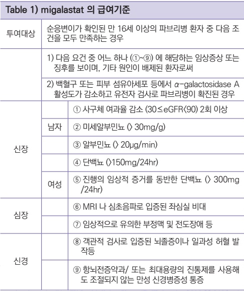 그러나, 효소 보충요법이 필요한 안정적인 파브리 환자들에게 주사 치료 1년 뒤 사용해 볼 수 있는 괜찮은 선택지가 될 수 있는 약으로 생각된다. 환자는 초회 처방시 한달에 한번씩 내원하여 약물을 처방받아 이틀에 한번씩 150mg 한알씩 복용하며, 약물 투약 전/후 2시간동안 음식물 섭취를 금한다. 2021년 10월 1일부터 급여 기준이 변경되어 최초 투약일로부터 6개월 후 안정적인 환자에게 60일분까지 투약 가능하다 (Table 1 급여기준).