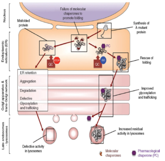 Migalastat은 영국에서 개발된 경구용 샤페론 제제로 알파-갈라토시다제의 특정 돌연변이 형태에 결합하여 효소를 안정화시켜 효소가 리소솜 내에 갇혀서 효소 활성이 증가될 수 있도록 유도하는 약제이다 (그림 1).