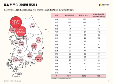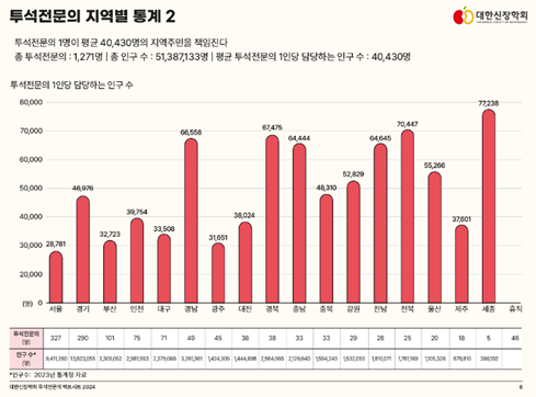 지역별 투석전문의 분포를 살펴보면, 서울이 327명으로 가장 많은 투석전문의가 근무하고 있으며, 세종이 5명으로 가장 적은 투석전문의가 근무하고 있는 것으로 나타났습니다. 투석전문의 1인당 평균 40,430명의 지역주민을 담당하고 있으며, 투석전문의 1인당 담당 인구수는 서울이 28,781명으로 가장 적었고, 세종이 77,238명으로 가장 많았습니다(그림 4).