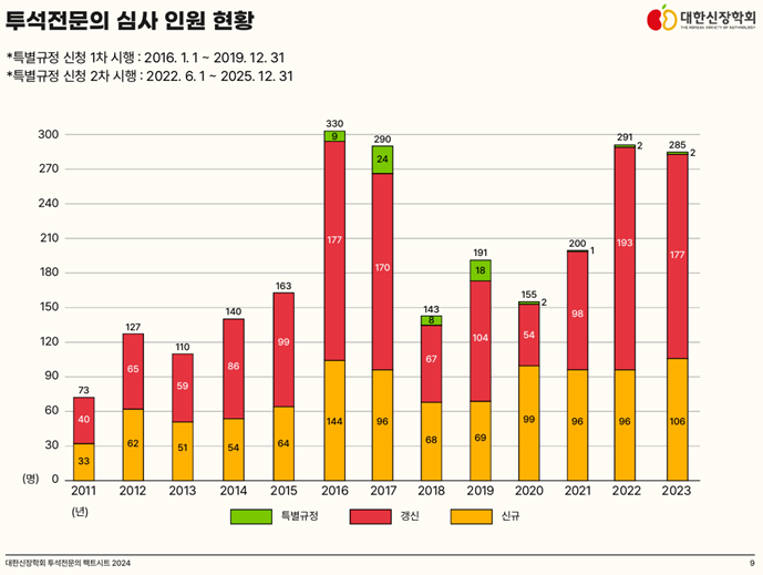 이는 신장분과전문의 제도 시행 이전(2004년 7월)에 이미 혈액투석 업무를 시작했으나 투석전문의 자격을 취득하지 못한 내과, 소아청소년과 전문의가 대상입니다. 1차 심사는 2016년 1월부터 2019년 12월까지 시행하였고, 2차 심사는 2022년 6월부터 2025년 12월까지 실시할 예정입니다. 투석전문의 심사 인원은 2011년부터 2017년까지 꾸준히 증가하다가 2018년 감소했으나, 이후에도 꾸준히 증가하여 최근에는 매년 280명 이상 심사하고 있습니다(그림 5).