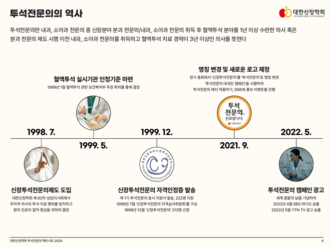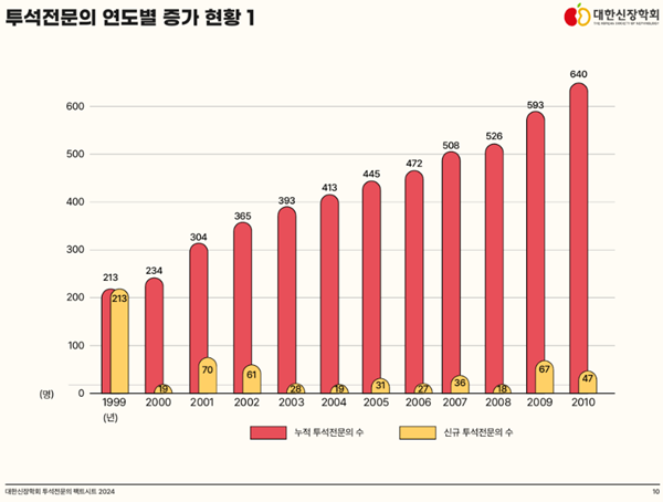 대한신장학회 투석위원회는 투석전문의 25주년을 기념하여 2024년 6월 12일 ‘대한신장학회 투석전문의 Factsheet 2024’를 발표하였습니다. 이번에 발간된 Factsheet는 1999년부터 2023년까지 대한신장학회 심의를 통해 결정된 투석전문의에 관한 전체 자료를 분석하여, 현재 우리나라 투석전문의의 현황을 효과적으로 보여주는 중요한 의미를 지닌 자료입니다.