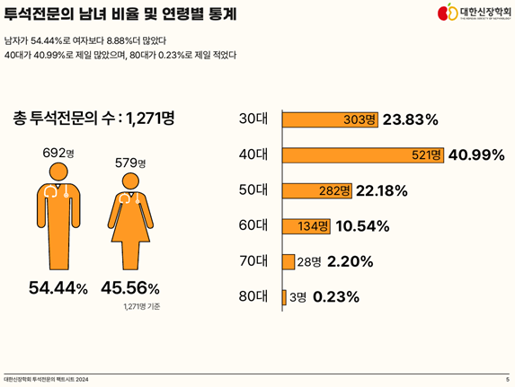 2023년 12월 기준 총 투석전문의는 1,217명으로 지난 10년간 누적 투석전문의는 885명, 신규 투석전문의는 84명 증가하였습니다. 투석전문의는 40대가 41%로 가장 많았고, 80대가 0.2%로 가장 적었습니다(그림 2).