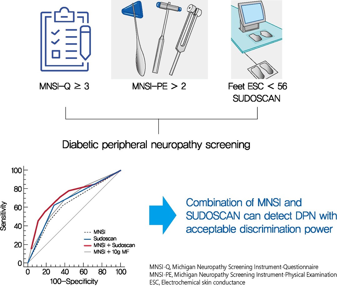 MNSI의 설문지와 신체 검진에 SUDOSCAN을 접목할 경우 70.0%의 민감도와 66.3%의 특이도로 당뇨병성 신경병증을 진단할 수 있음을 최근에 보고하였다 (그림 1). 향후 SUDOSCAN만 사용할 경우에도 효율적으로 당뇨병성 신경병증을 진단할 수 있는지 재확인하여 향후 임상에서의 활용성을 타진할 필요가 있겠다.