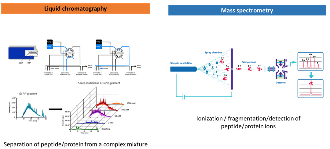 이 LC 과정을 통해 복잡한 peptide 혼합물을 분리, 분획하고 on-line으로 바로 질량분석기의 ion source 부분으로 도입되어 peptide를 이온화하게 된다. 대부분의 LC는 250~300nl/min의 유속을 사용하여 내경 75~50um의 C18 컬럼을 통해 peptide를 분리하게 되고 Electrospray ionization (ESI)의 형식으로 peptide를 이온화시킨다.