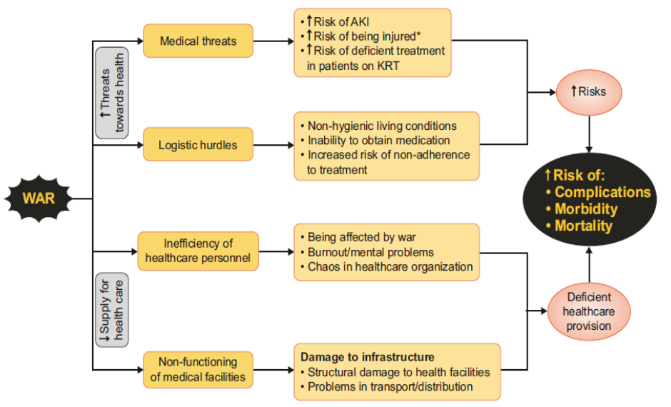 전쟁은 사회기능을 마비시키며, 의료시설도 제 기능을 할 수 없고, 물자의 이동도 제한되기 때문에 노인, 소아, 만성질환자는 재난에 더욱 취약해진다. 전쟁으로 인한 의료 인력의 부족, 의료시설 파괴, 물자 조달의 어려움, 비위생적 환경 등으로 신장 합병증과 사망률이 급증할 수 있다. 의료 서비스뿐 아니라 교통, 전기, 수도, 통신과 같은 인프라의 파괴가 동반될 수 있어 생명 유지를 위한 투석 치료의 연장이 어려워 특히 혈액투석 환자들에게 재앙이 초래될 수 있다.