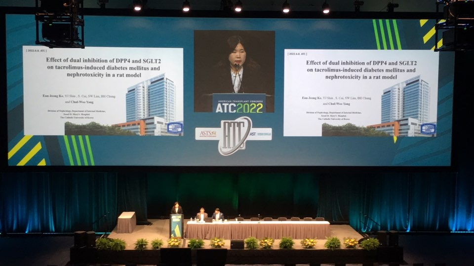 이러한 SGLT2i에 대한 뜨거운 관심 덕분인지, 제출한 초록(제목: Effect of dual inhibition of DPP4 and SGLT2 on tacrolimus-induced diabetes mellitus and nephrotoxicity in a rat model)이 Top Abstract로 선정되어, 영광스럽게도 Plenary Session에서 구연 발표를 하는 기회를 얻게 되었다. 이전에 ATC의 세부 세션에서 구연발표를 했을 때도 무척 긴장이 되었는데, Plenary Session처럼 큰 자리에서 발표를 할 기회를 얻게 되어서 더욱 긴장되었으나 무척 영광이었고 감사했다. 그래서인지 이번 학회는 이 때문에 평생 잊지 못할 “인생 추억”이 될 것 같다.