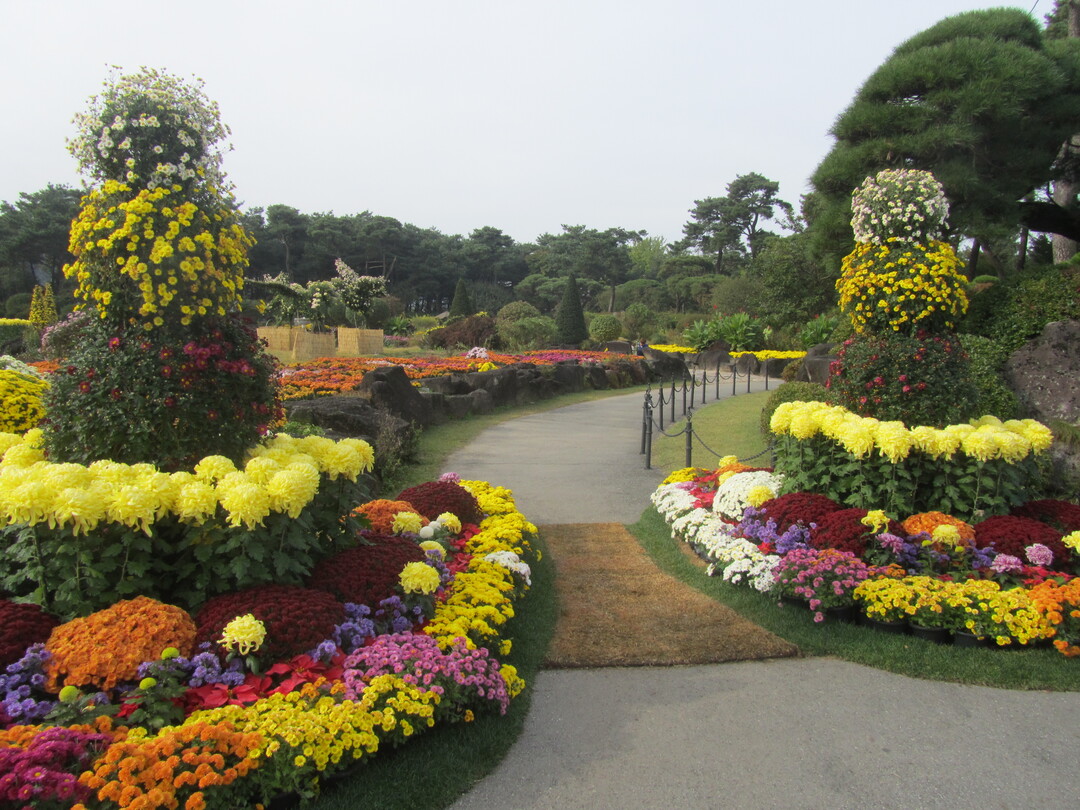 수목원에 들어서는 순간 형형색색의 오색찬란한 국화와 푸른 소나무들이 어우러져 한 폭의 풍광이 펼쳐진다. 예쁜 국화를 배경으로 아름다운 사진 작품을 만드느라 다들 정신없이 분주하다. 천천히 둘러보니 별, 나비, 말 등의 모양에서부터 파리의 에펠탑 모양까지 다양한 국화 조각상들이 서 있다.
